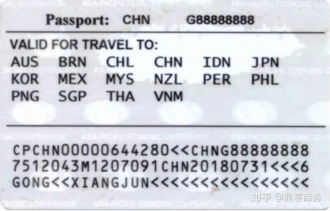 我國持卡人旅行卡背面的外方經(jīng)濟體縮寫最多可有16個:JPN(日本),KOR(韓國),MYS(馬來西亞),IDN(印度尼西亞),BRN(文萊),PHL(菲律賓),SGP(新加坡),MEX(墨西哥),THA(泰國),VNM(越南),AUS(澳大利亞),NZL(新西蘭),PNG(巴布亞新幾內(nèi)亞),CHL(智利),PER(秘魯),RUS(俄羅斯)。其他經(jīng)濟體的英文縮寫是:CHN(中國),HKG(中國香港),TWN(中國臺北),USA(美國),CAN(加拿大)。