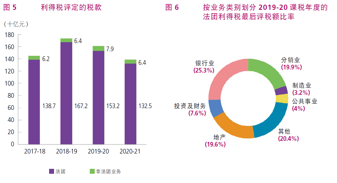 根據(jù)年報(bào)數(shù)據(jù)顯示2020-21年度稅務(wù)局的整體稅收為3,308億元,較上年度增加272億元,即9%,增長(zhǎng)主要來(lái)自薪俸稅和印花稅。薪俸稅及印花稅收入分別為750億元及890億元, 升幅達(dá)48.8%及32.5%。至于利得稅,全年收入為1,355億元,較上年度減少13.1%。稅務(wù)局在2020-21年度的稅收總額約佔(zhàn)政府一般收入的60.5%。利得稅及薪俸稅合共佔(zhàn)稅收總額的63.7%,印花稅則佔(zhàn)26.9%