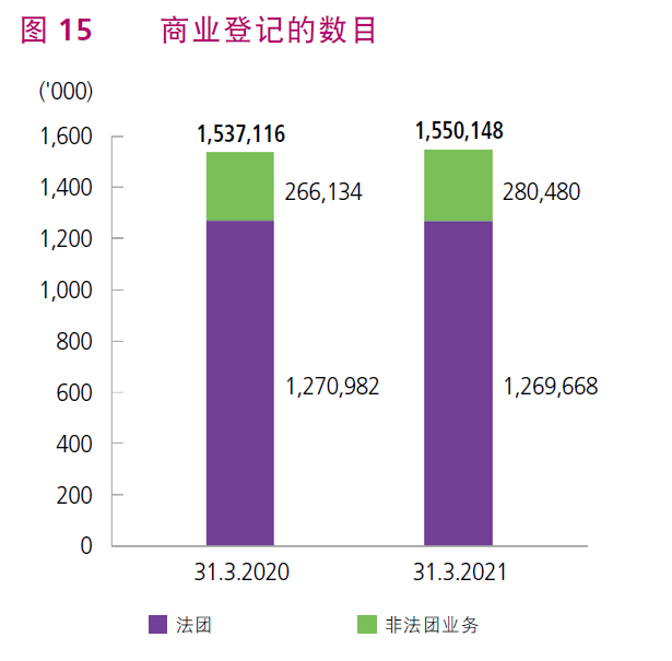 稅務(wù)局致力維持有效率的商業(yè)登記制度。在香港經(jīng)營(yíng)業(yè)務(wù)的人士須就業(yè)務(wù)辦理商業(yè)登記并繳納有關(guān)費(fèi)用。截至2021年3月31日商業(yè)登記的數(shù)目為1,550,148,較2020年3月31日增加了13,032 宗。