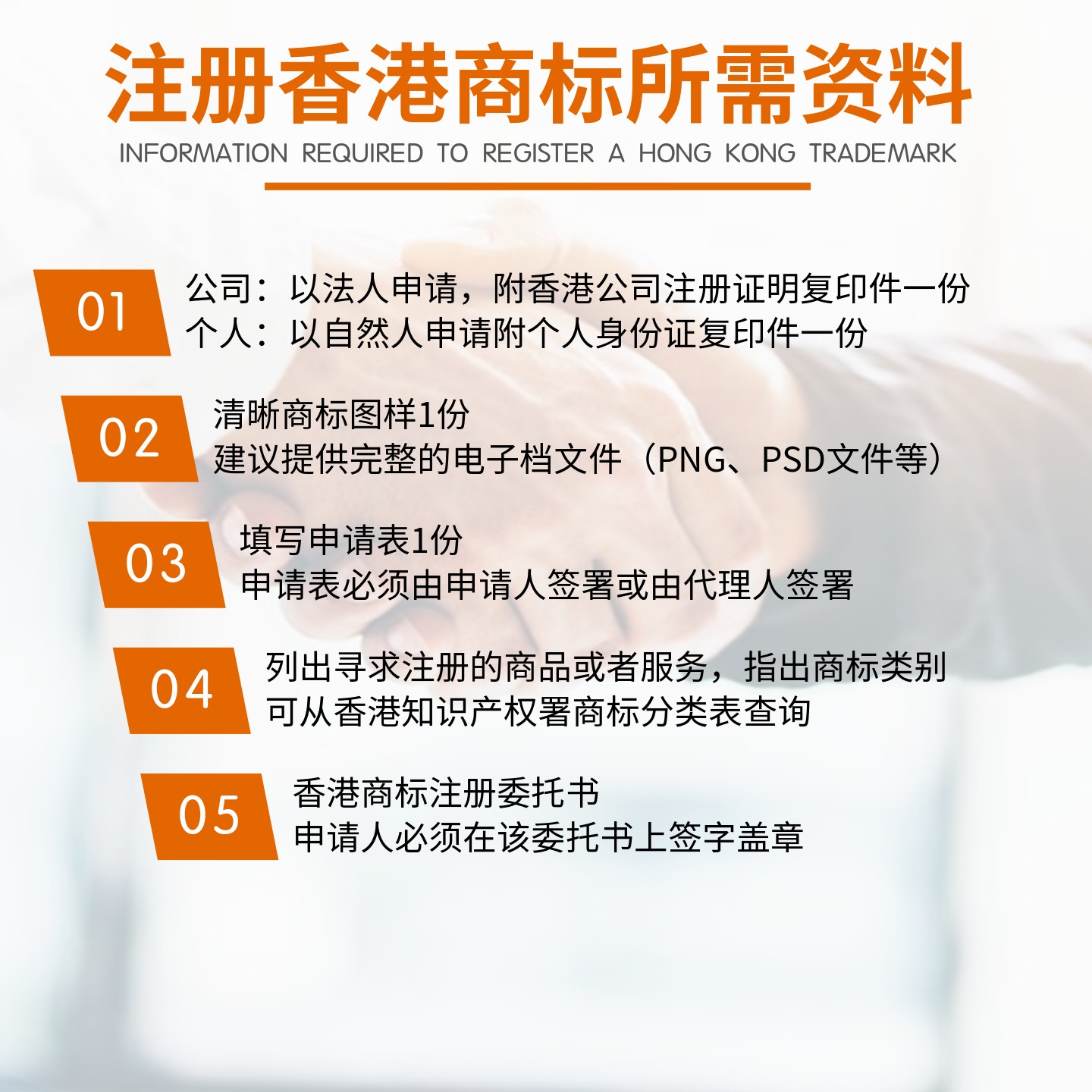 注:香港商標注冊處不接受郵政信箱或“轉交”地址。商標申請人須提供在香港的送達地址、電話號碼、傳真號碼及電郵地址(鼎亨可提供),