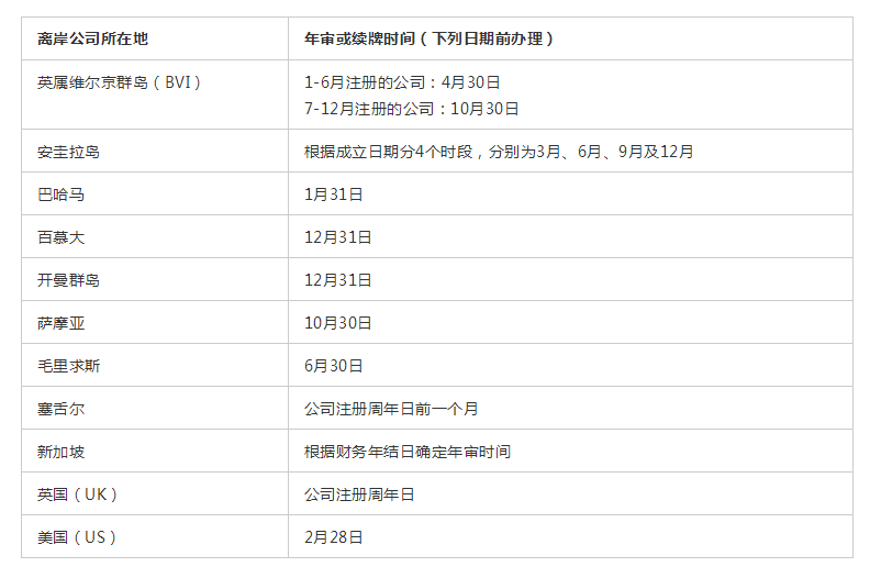 部分離岸公司年審或續(xù)牌時間:
